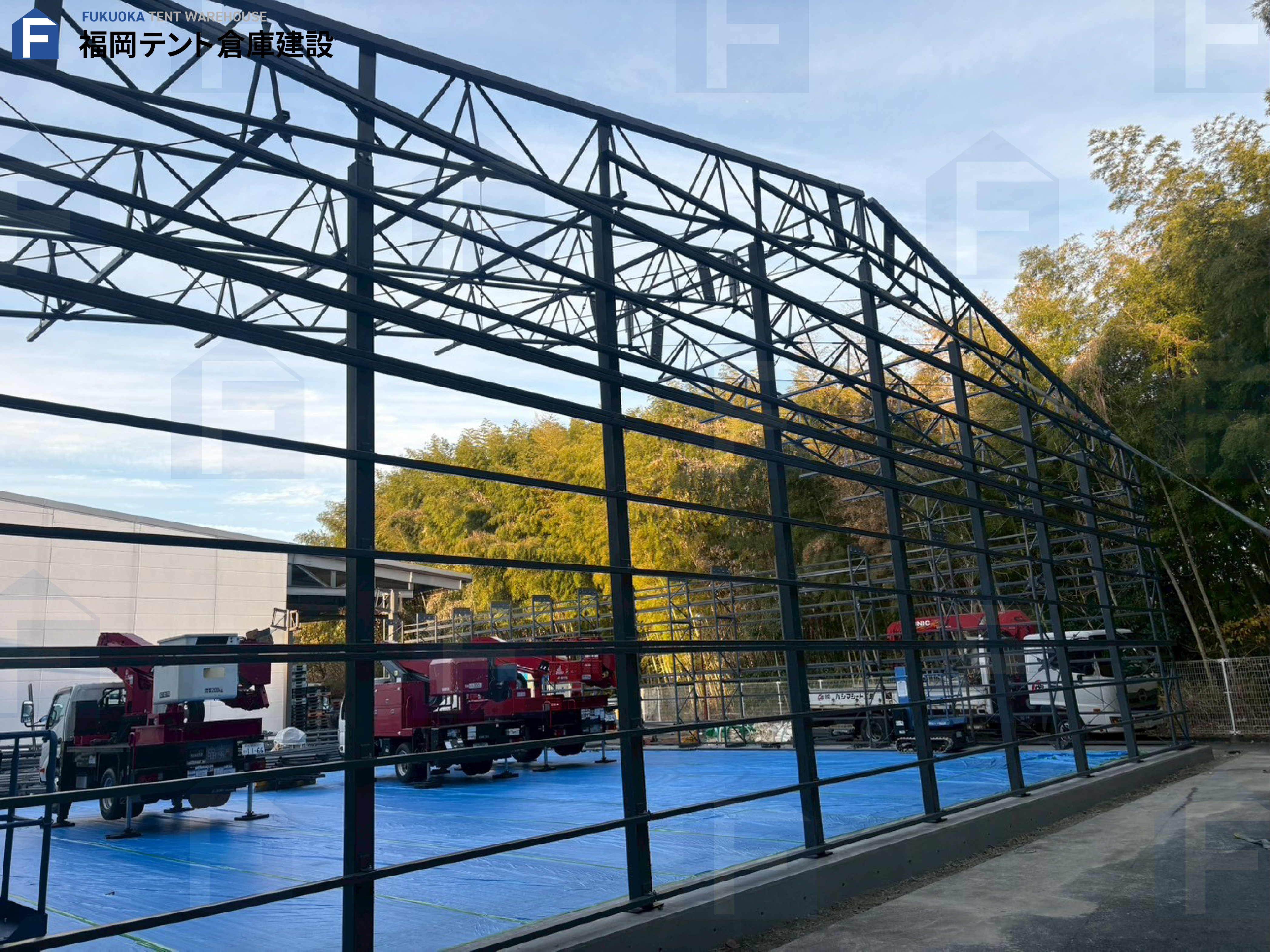 2025.12.17 ガルバリウム鋼板仕様の営業用倉庫!テント倉庫と上屋テントを建築中です! |福岡県 建設の場所 福岡県 種別 営業用ハイブリッドテント倉庫・上屋テント サイズ W20×L25×H5・W20×L7.8×H5.8 使用したテント生地 ターポロンG-3000Ⅱ オプション ガルバリウム鋼板・ガラあスクロス(内幕)・ハンガー扉・サッシ窓 担当スタッフからのコメント 現在進行中で福岡県で大型の営業用倉庫を建築中です。営業用の倉庫として利用するため様々な建築基準法に沿って進められたテント倉庫となります。まだ完成はしておりませんが、後日完成後の投稿をさせていただきます。ぜひお楽しみに!テント倉庫についてお気軽にお問い合わせください。