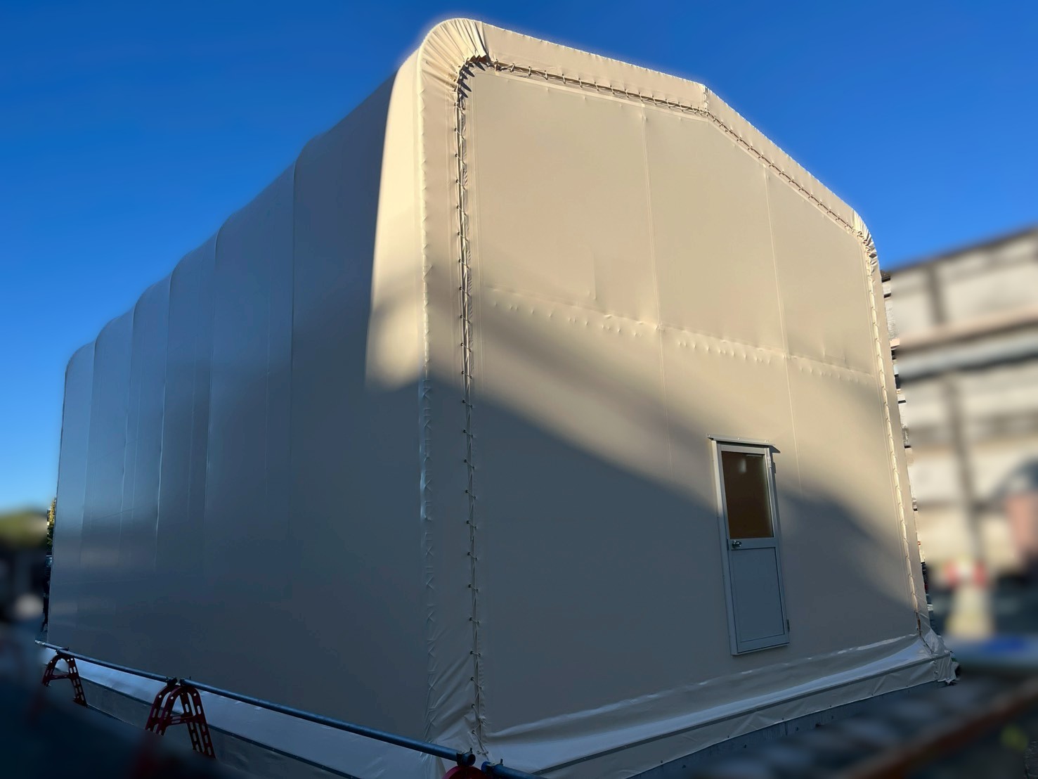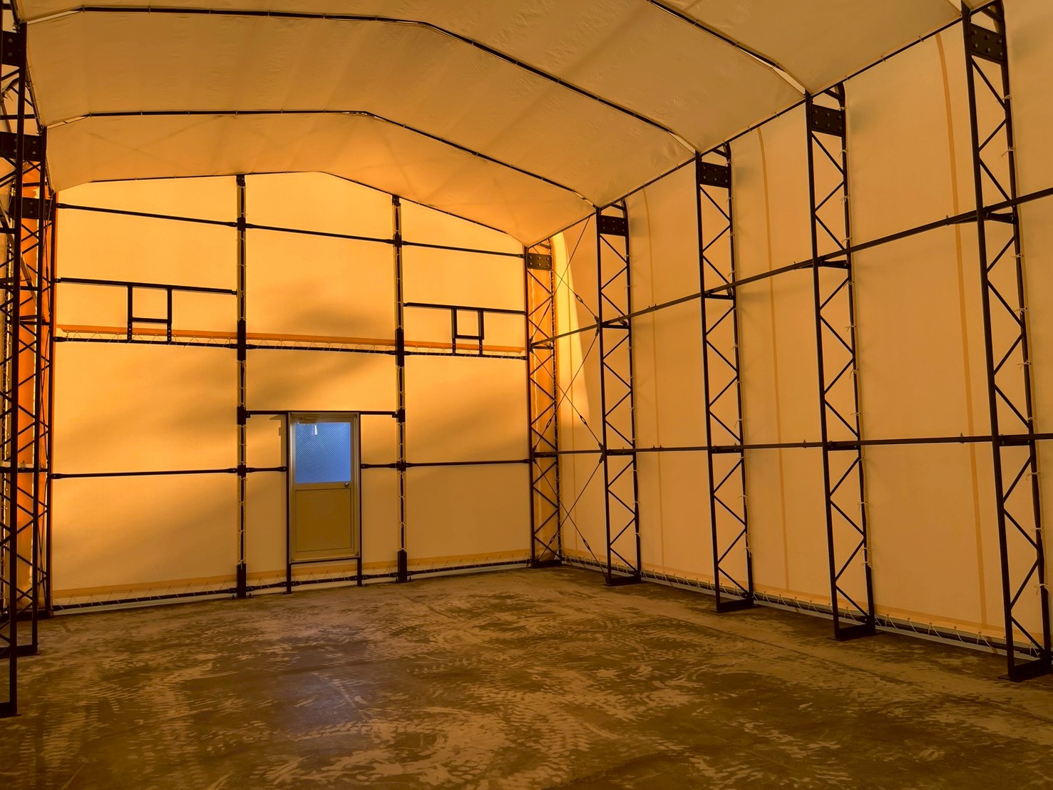 2025.11.26 工場の敷地内を有効活用!テント倉庫を建築しました! |福岡県 建設の場所 福岡県 種別 テント倉庫 サイズ W7×L11×H5 使用したテント生地 ウルトラマックス タイプC オプション 芯材カーテン サッシドア ガラスクロス(内幕) 担当スタッフからのコメント 今回は福岡県でテント倉庫を建築しました。工場の敷地内に有効活用し、テント倉庫を建てたいと要望を受け建築させていただきました。片方の妻面の開口部は芯材カーテン仕様となっており出入りがしやすいのが特徴です。反対にはサッシドア、天井にはガラスクロスを取り付けております。ガラスクロスがあることで結露対策・防塵等、様々なメリットがございます。無料で見積りを行っております。まずはお気軽にお問い合わせください!